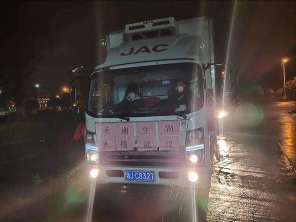 圣湘生物捐赠的第一批医疗设备、试剂以及配套耗材,顺利抵达武汉。与当地合作商一起,装运货物入库。